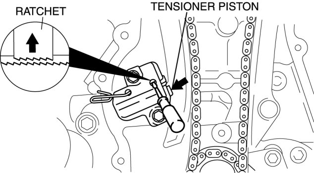 1. Using a thin screwdriver, hold the chain tensioner ratchet lock mechanism away from the ratchet stem.