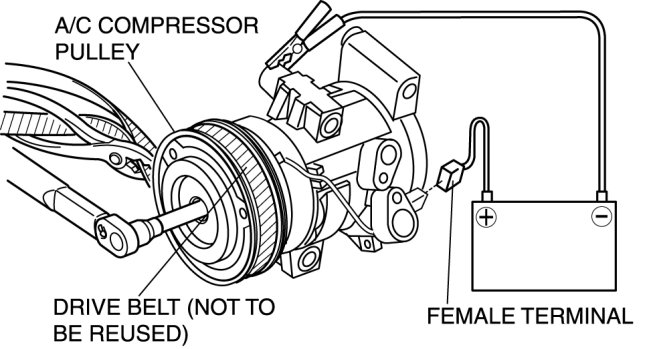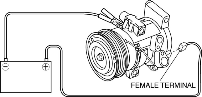 a. Apply battery positive voltage to the magnetic clutch terminal and connect the A/C compressor body to the ground.