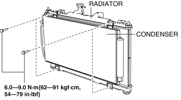11. Remove the condenser from the radiator. Do not allow remaining compressor oil in the refrigerant line to spill.