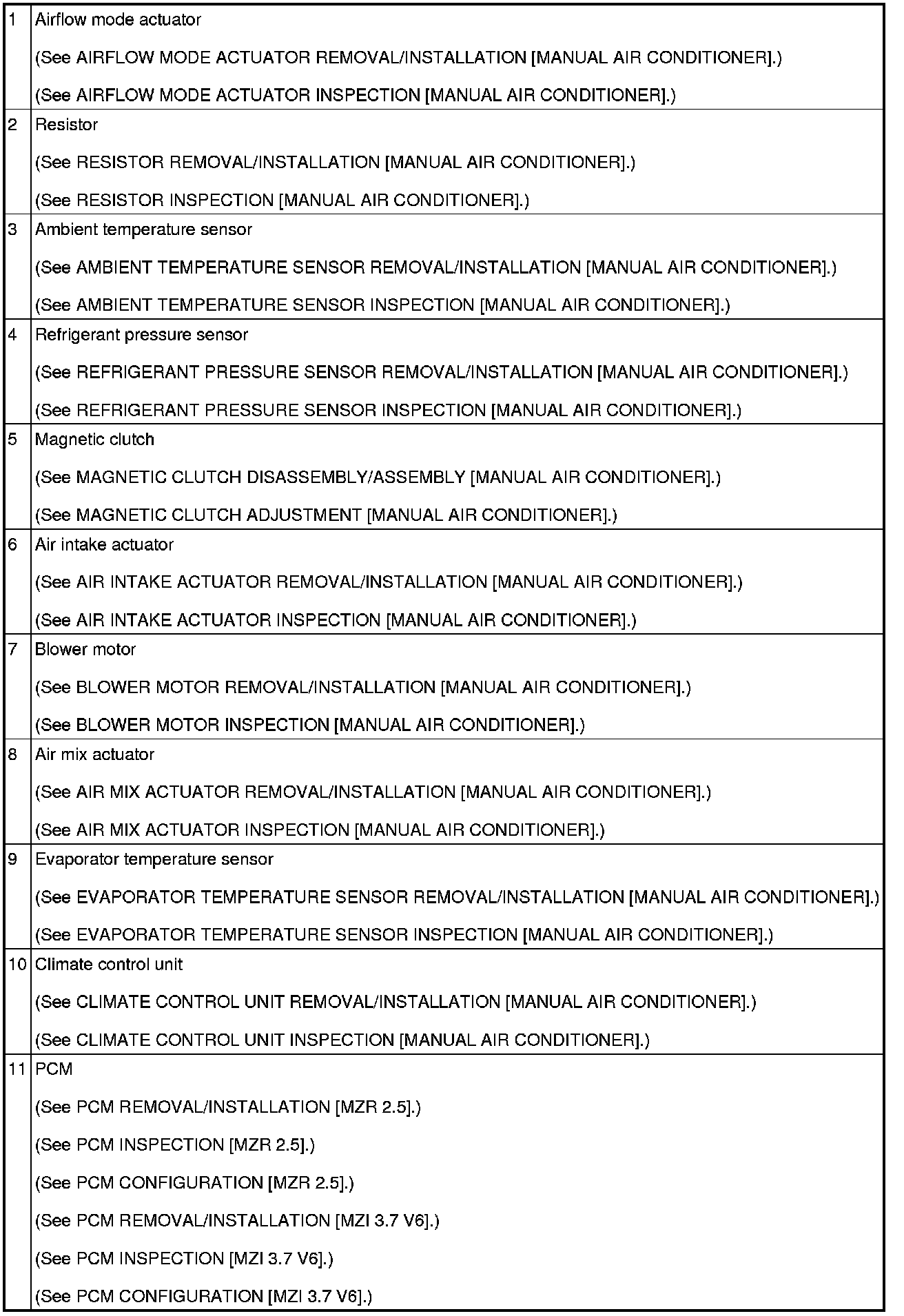 HVAC CONTROL SYSTEM LOCATION INDEX [MANUAL AIR CONDITIONER]