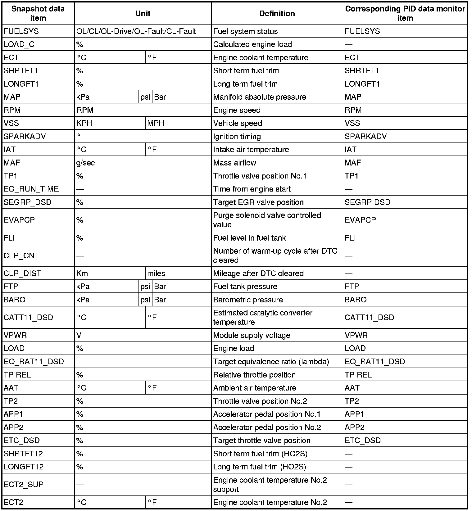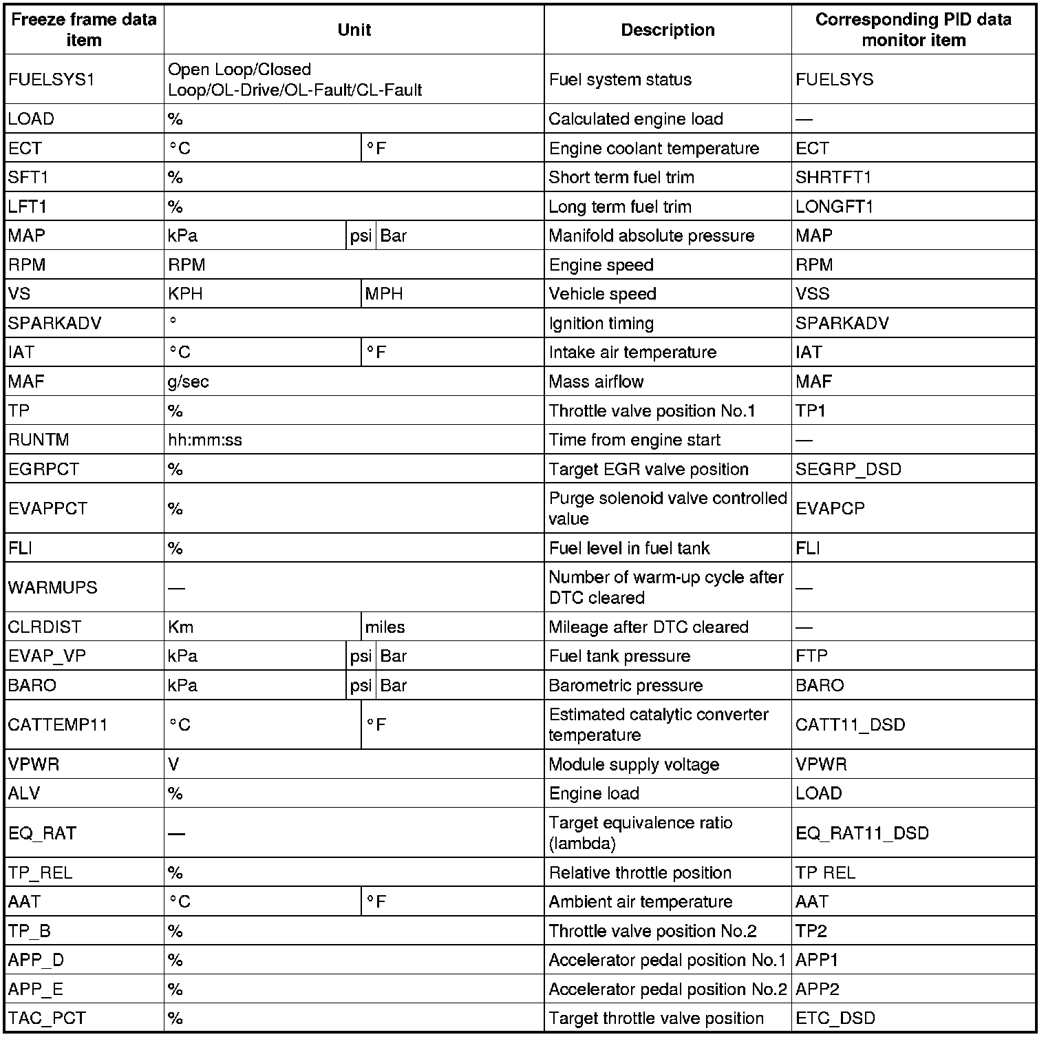 - For the freeze frame data, if there are several malfunctions in the engine control system, the data for the malfunction which occurred initially is stored. Thereafter, if a misfire or fuel injection control malfunction occurs, data from the misfire or fuel injection control malfunction is written over the initially stored data. However, if the initially stored freeze frame data is a misfire or fuel injection control malfunction, it is not overwritten.