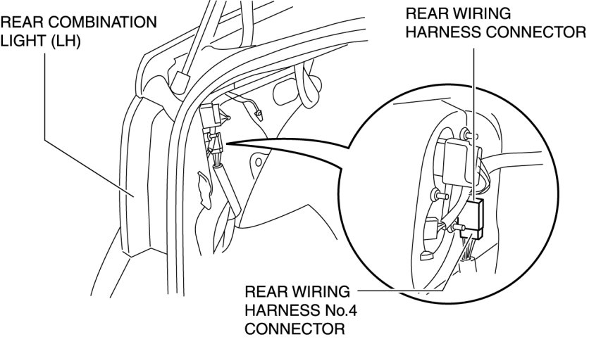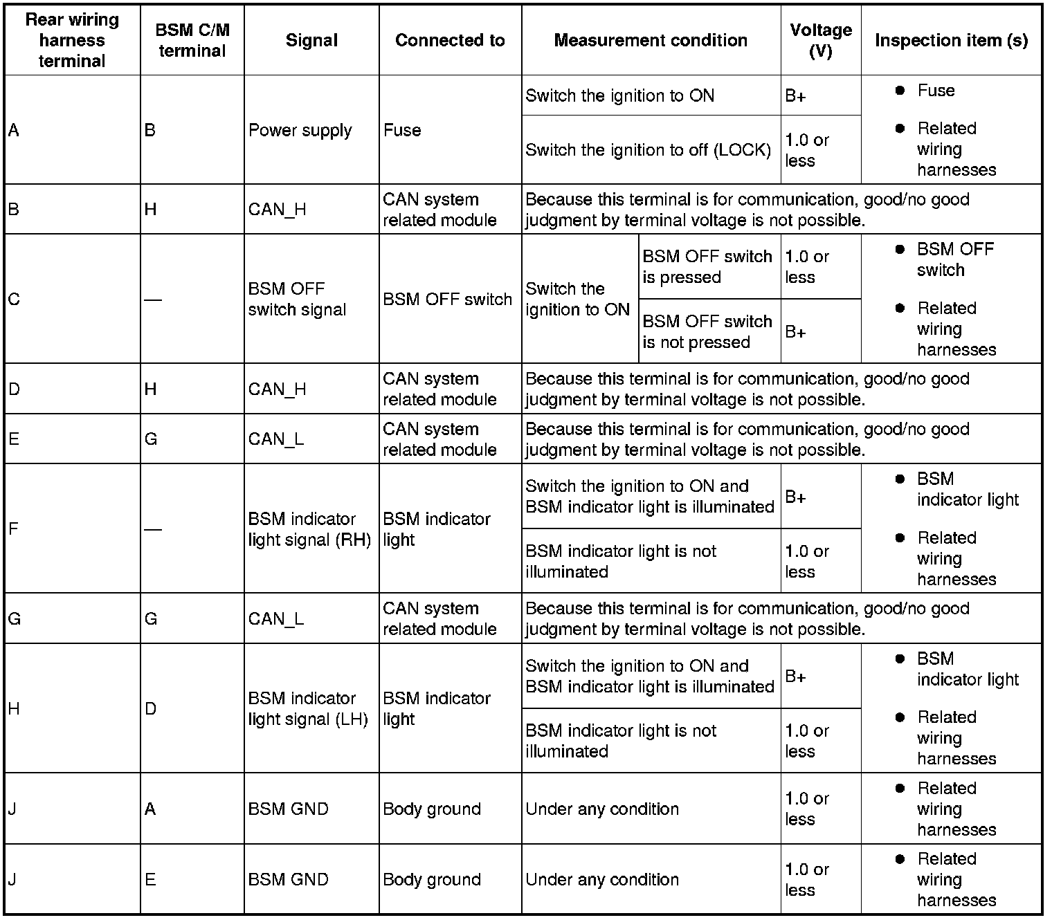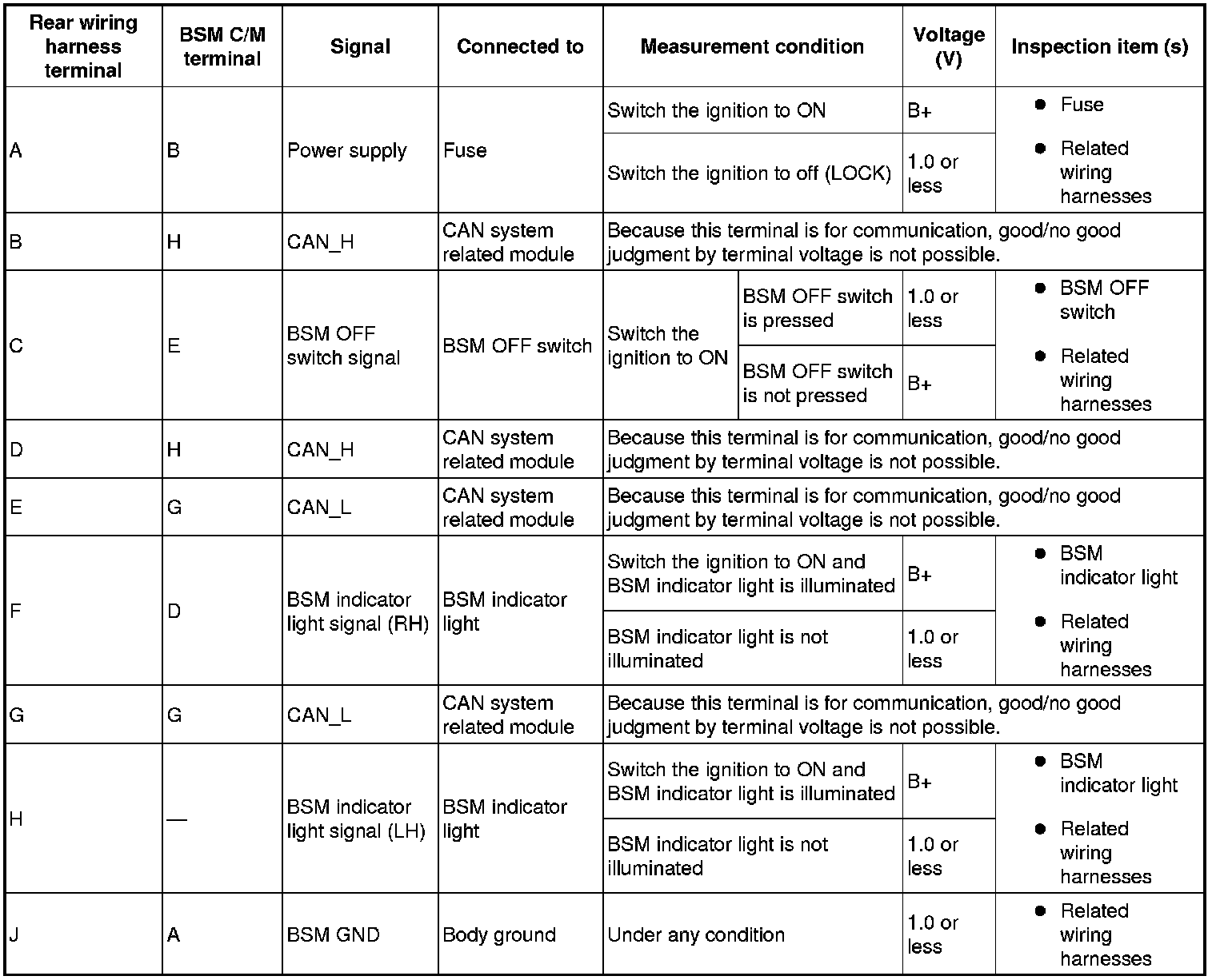 - The BSM control module connector cannot be connected to a tester due to its water-resistance processing, therefore the rear wiring harness connector is used for measuring the terminal voltage.