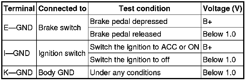 2. According to the table, measure the voltage between selector lever component terminals and body GND.