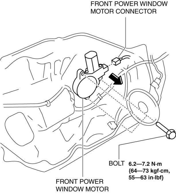 5. Disconnect the front power window motor connector, remove the bolt, then remove the front power window motor from the front power window regulator drum in the direction of the arrow shown in the figure.