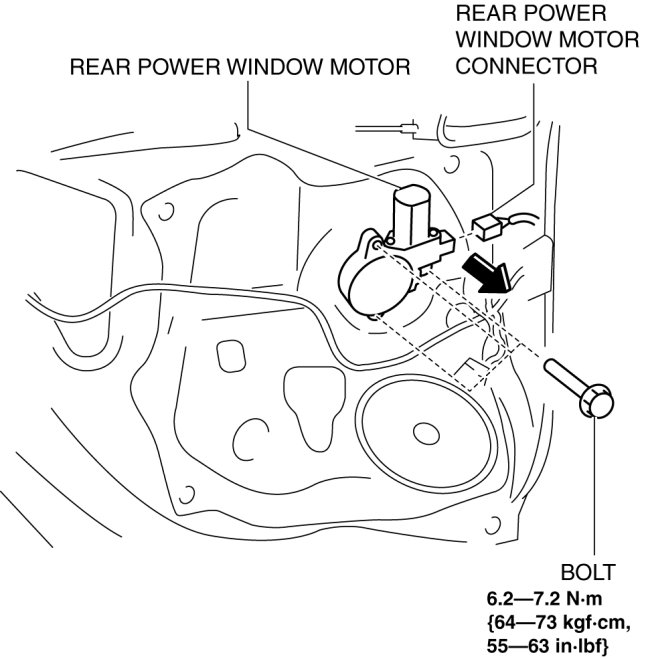 4. Disconnect the rear power window motor connector, remove the bolt, then remove the power window motor from the power window regulator drum in the direction of the arrow shown in the figure.
