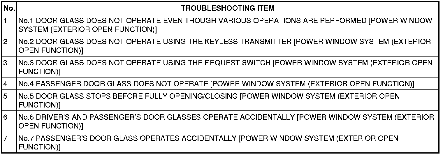 SYMPTOM TROUBLESHOOTING CHART [POWER WINDOW SYSTEM (EXTERIOR OPEN FUNCTION)]