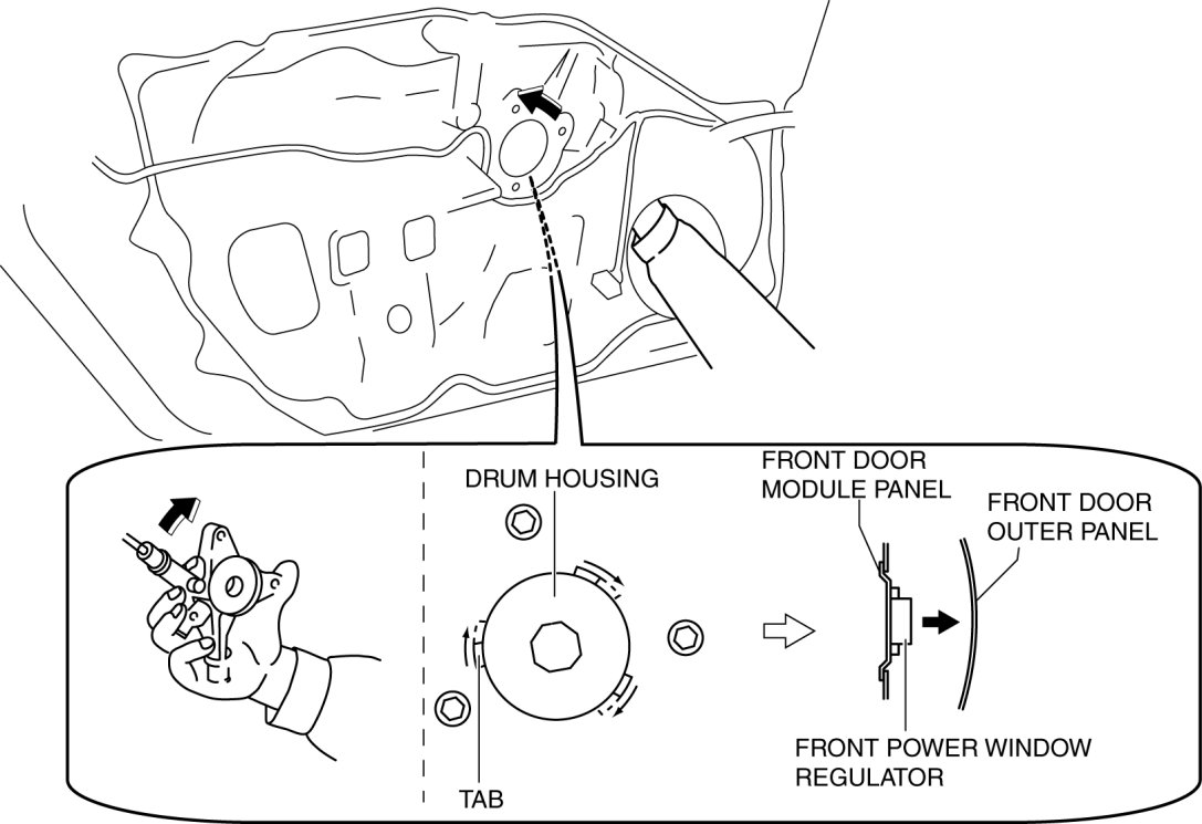 5. Insert a hand through the front door speaker installation hole and rotate the drum housing in the direction of the arrow shown in the figure to detach the tabs from the front door module panel.