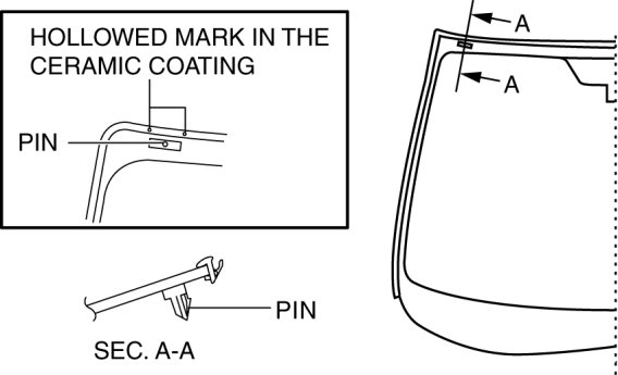 4. Align the alignment marks made before removal and install the pin to the windshield referring to the figure. (Reusing glass, pin removed)