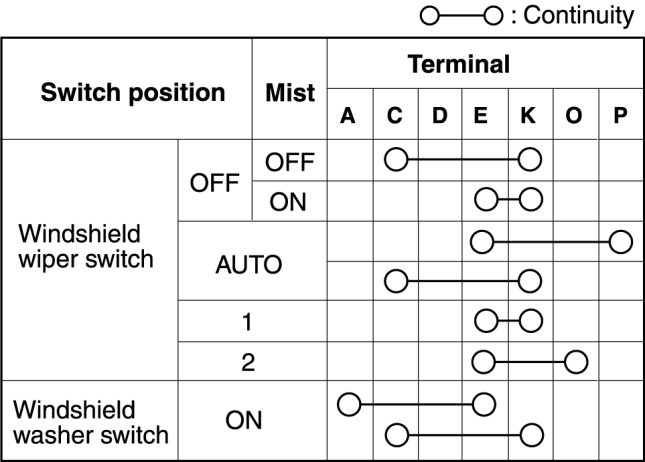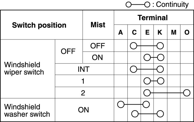 4. Verify that the continuity between the windshield wiper and washer switch terminals is as indicated in the table.