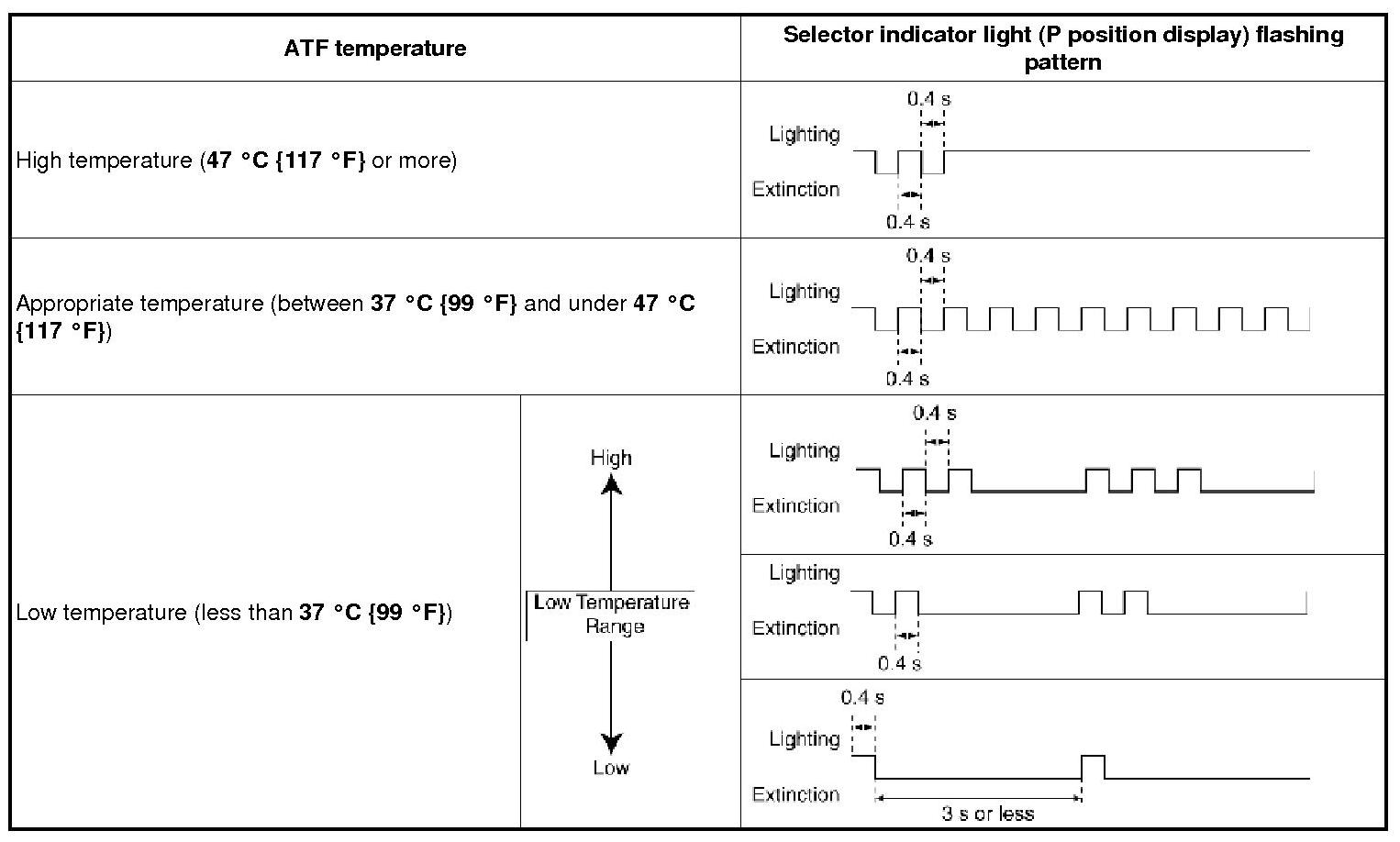 - Verify the ATF temperature using the P position display flashing pattern.