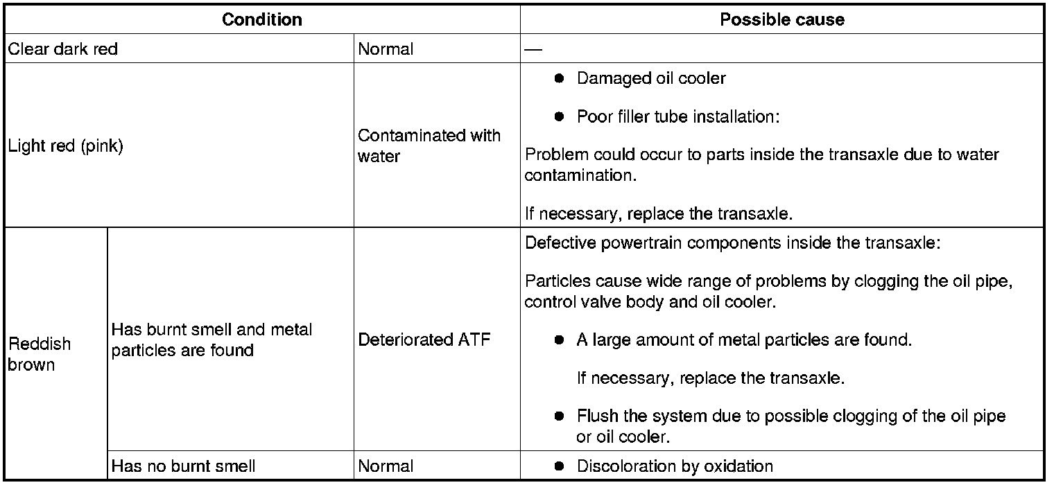4. Inspect the ATF for the following to determine whether the transaxle should be disassembled.