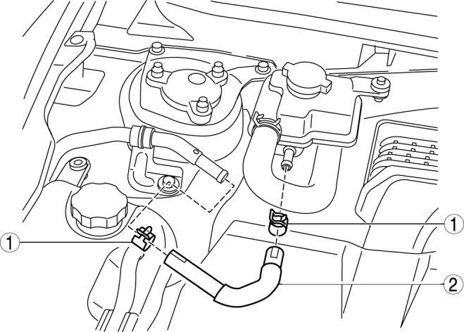 1. Remove the bolt shown in the figure, and position the power steering fluid reservoir out of the way.