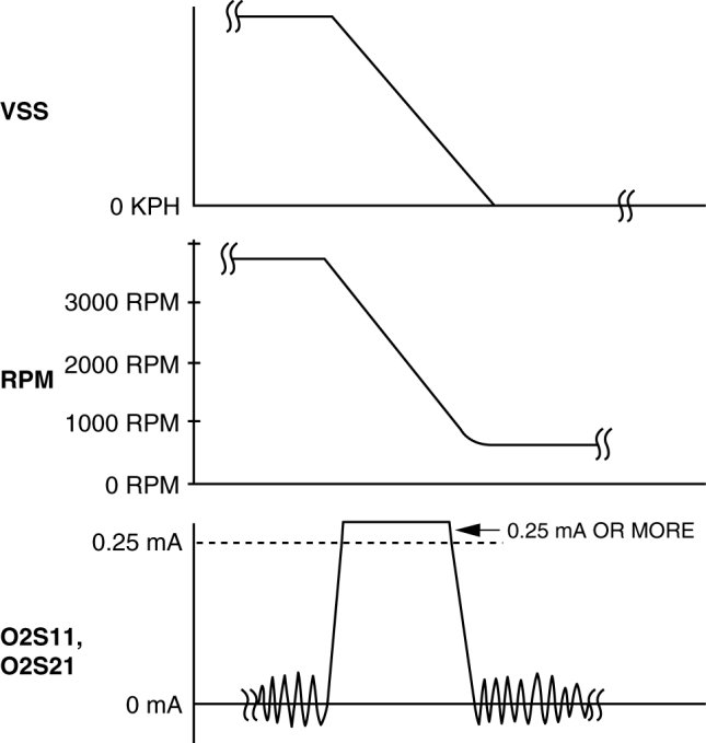 3. Release the accelerator pedal while the engine speed is at 3,000 rpm or more and verify that the following monitor items fluctuate as shown in the figure while the vehicle decelerates. On-Board Diagnostic Test