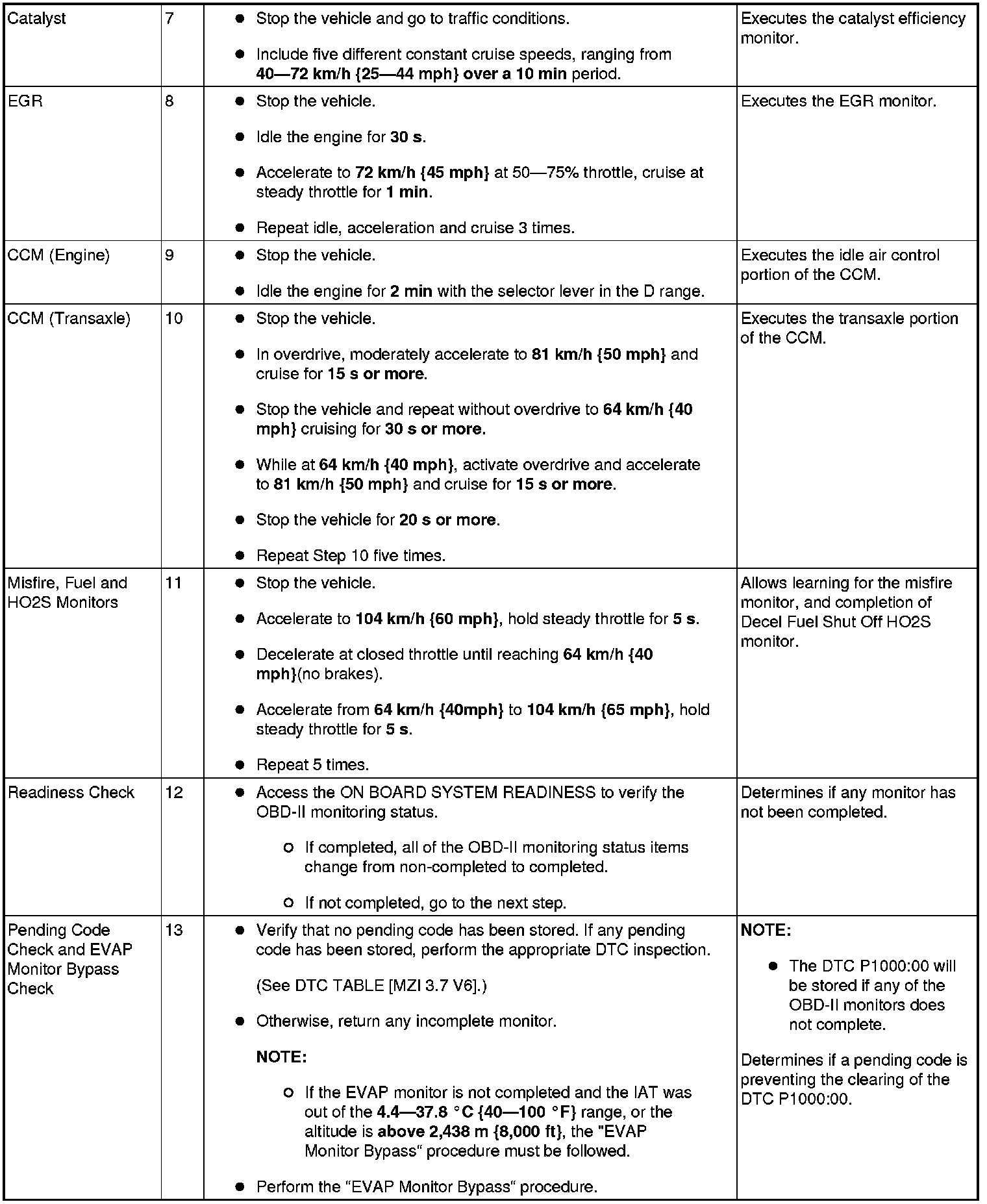 - The following procedure is designed to execute and complete the OBD-II monitors and to clear the Ford P1000:00, inspection/maintenance (I/M) readiness code. To complete a specific monitor for repair verification, follow steps 1 through 4, then continue with the step described by the appropriate monitor found under the OBD Monitor Exercised column. For the EVAP monitor to run, the ambient air temperature must be between 4.4-37.8 °C {40-100 °F}, and the altitude below 2,438 m {7,999 ft}. If the P1000:00 code must be cleared in these conditions, the PCM must detect them once (twice on some applications) before the EVAP monitor can be bypassed and DTC P1000:00 is cleared. The EVAP bypassing procedure is described in the following drive cycle.