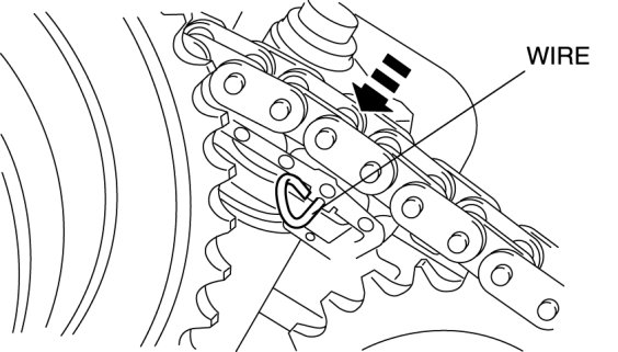 6. Remove the retaining wire inserted into the camshaft timing chain tensioner (LH).