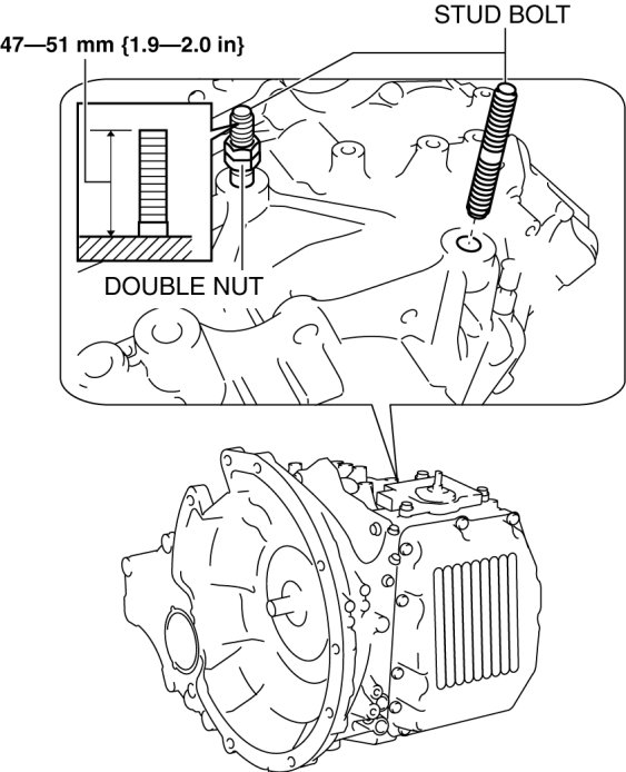 - Do not overtighten the stud bolts. (The stud bolts should remain protruded from the end of the transaxle case more than 47 mm {1.9 in}.)