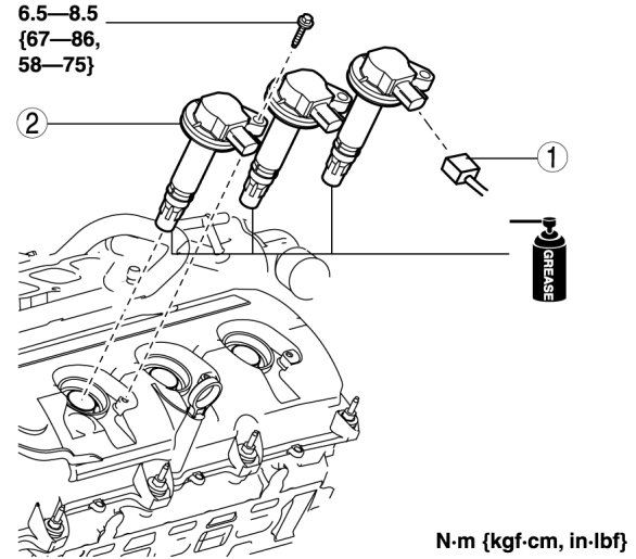 - Apply small amount of the specified dielectric grease to the inside of the ignition coils, then install the ignition coils to the spark plugs.