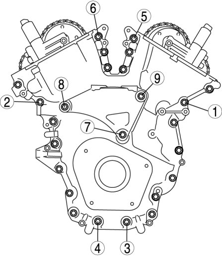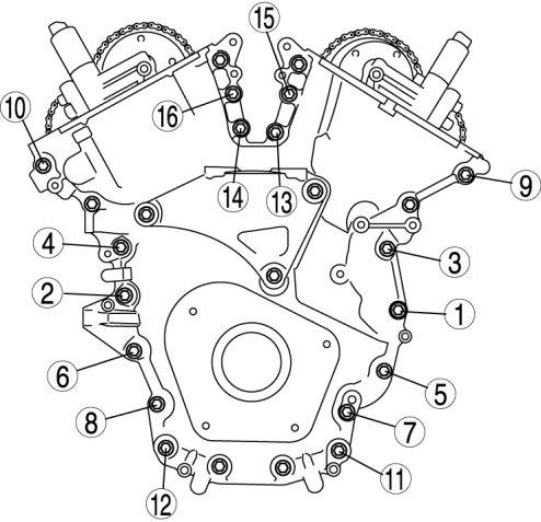Tighten the engine front cover bolts in the order in 2 steps in the order shown in the figure.