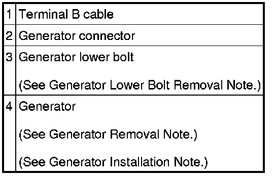 - The generator lower bolt cannot be fully removed from the engine because it contacts the body frame. However, the generator can be removed/installed without fully removing the lower bolt because there is a notch at the lower bolt installation part of the generator.