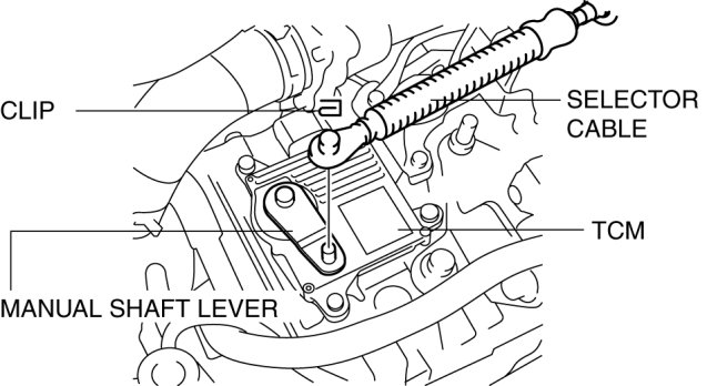 4. Remove the clip from the selector cable and disconnect the selector cable from manual shaft lever.