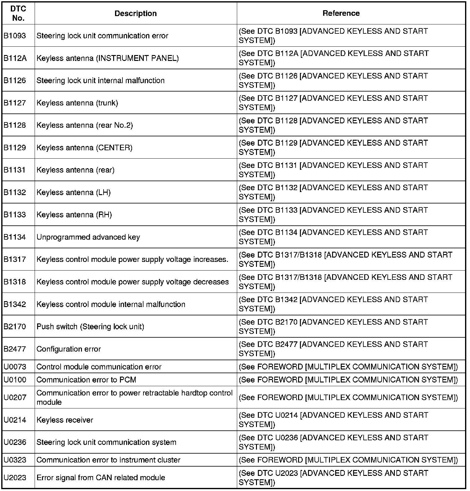 DTC TABLE [ADVANCED KEYLESS AND START SYSTEM]