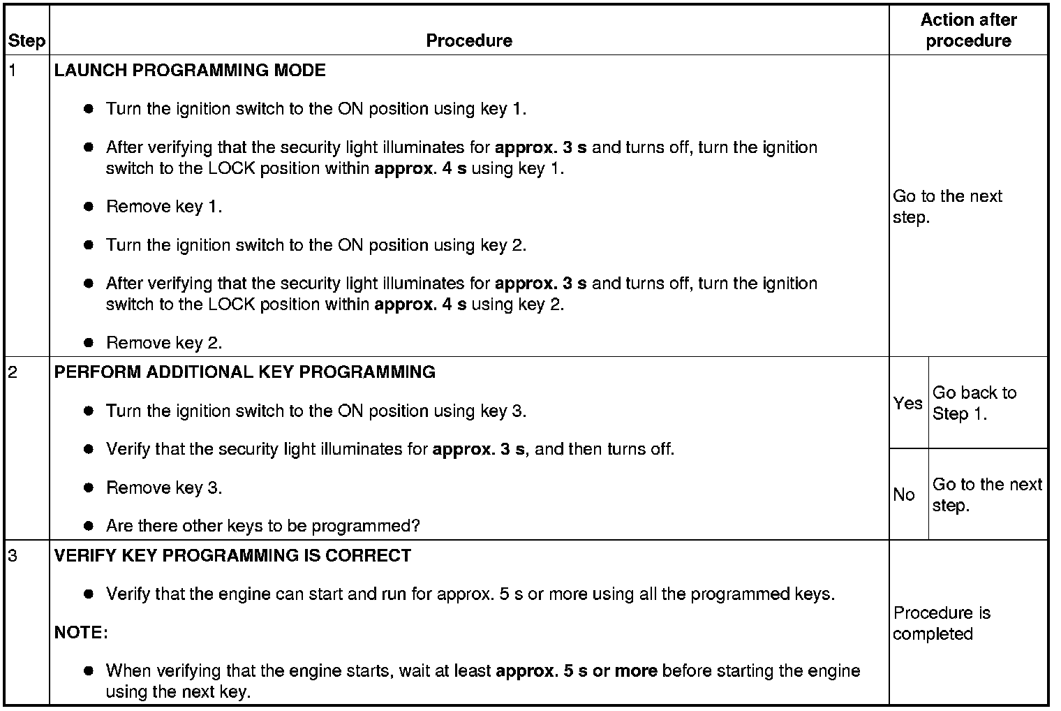 Immobilizer System-Related Parts Service and Programming Procedure Table