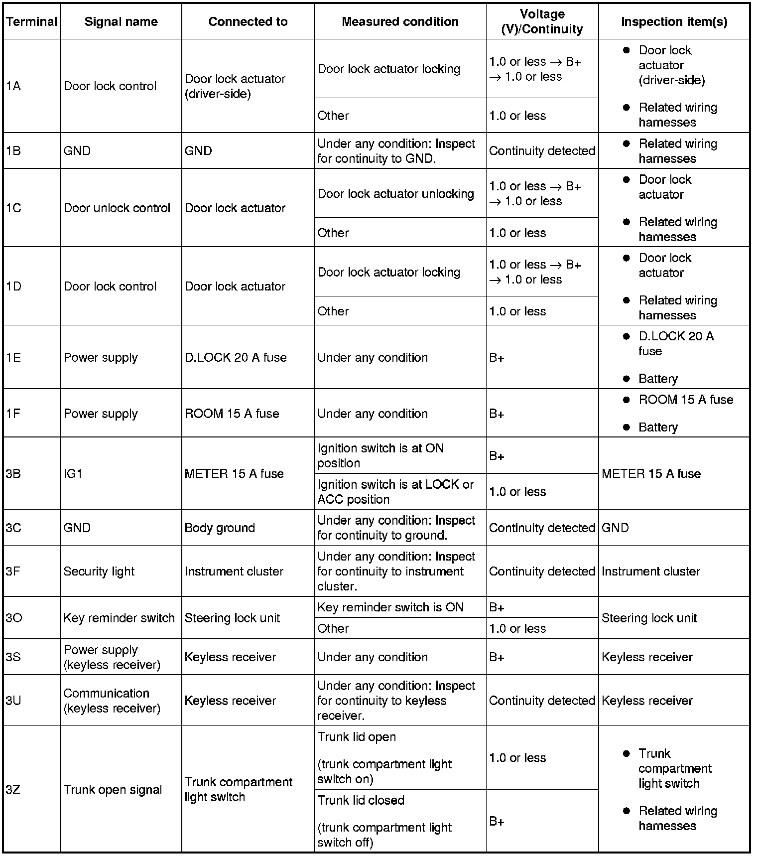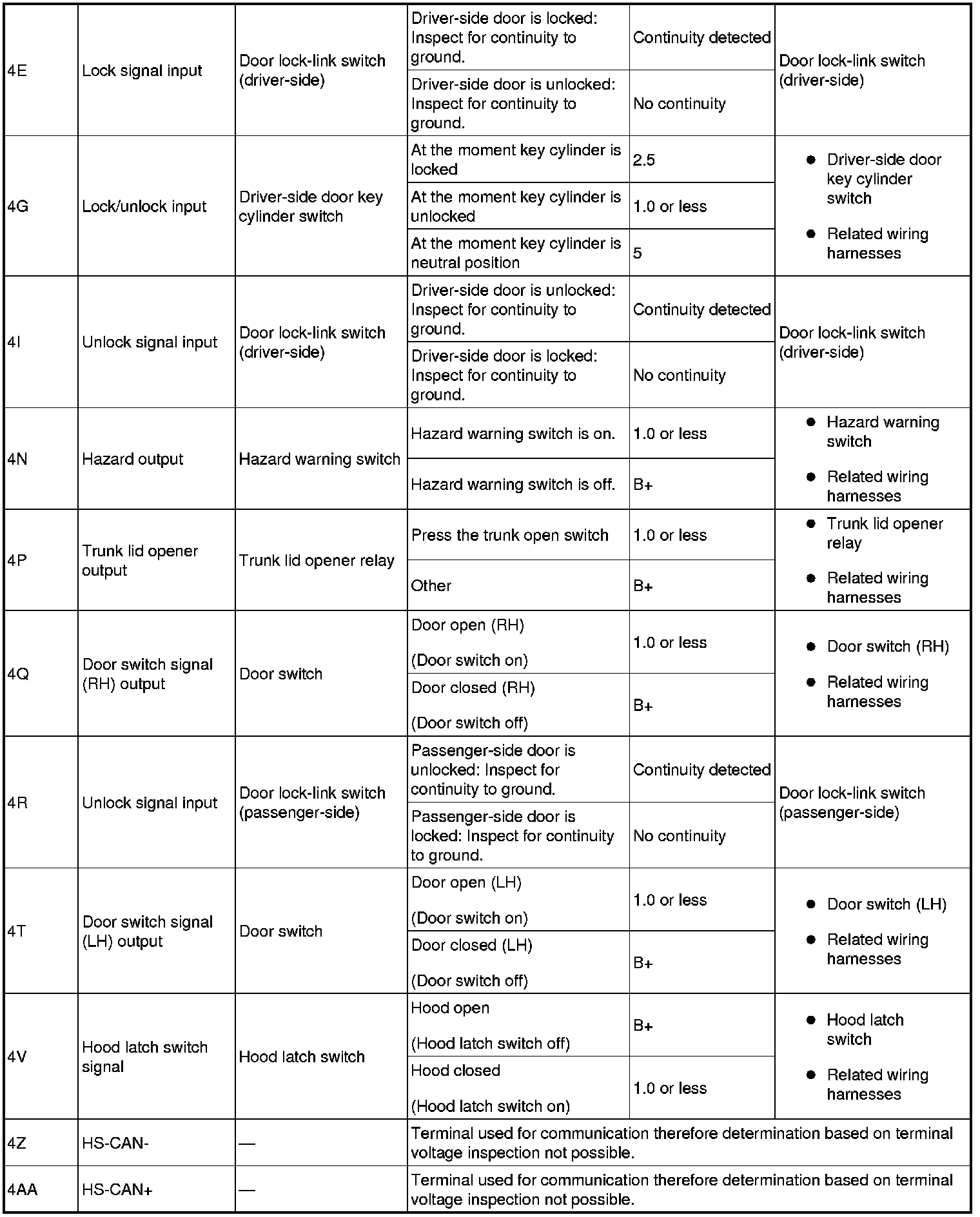 - If the voltage is not as specified in the Terminal Voltage Table (Reference), inspect the parts under "Inspection item(s)" and related wiring harnesses.