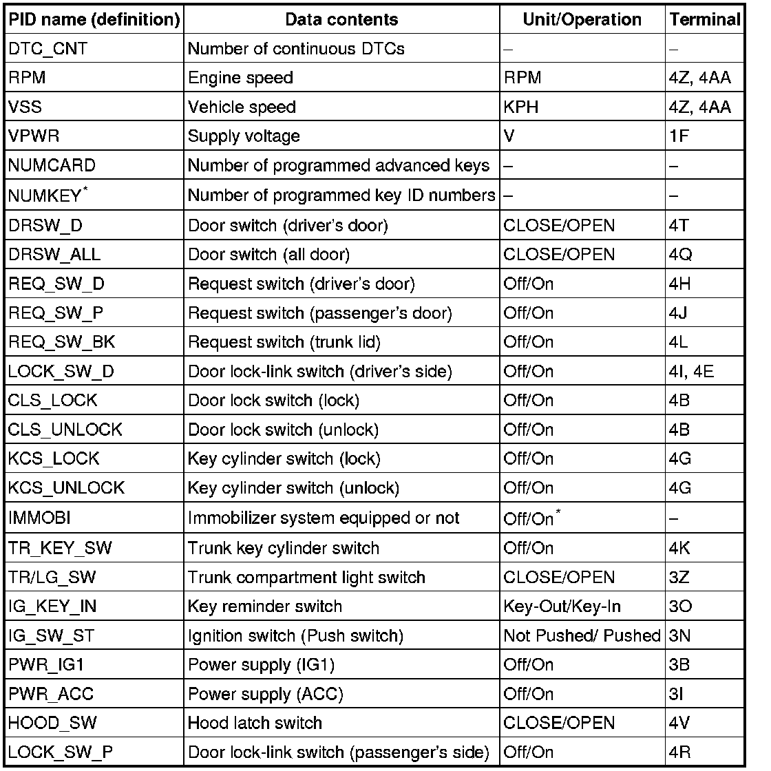 PID/DATA MONITOR TABLE [ADVANCED KEYLESS AND START SYSTEM]