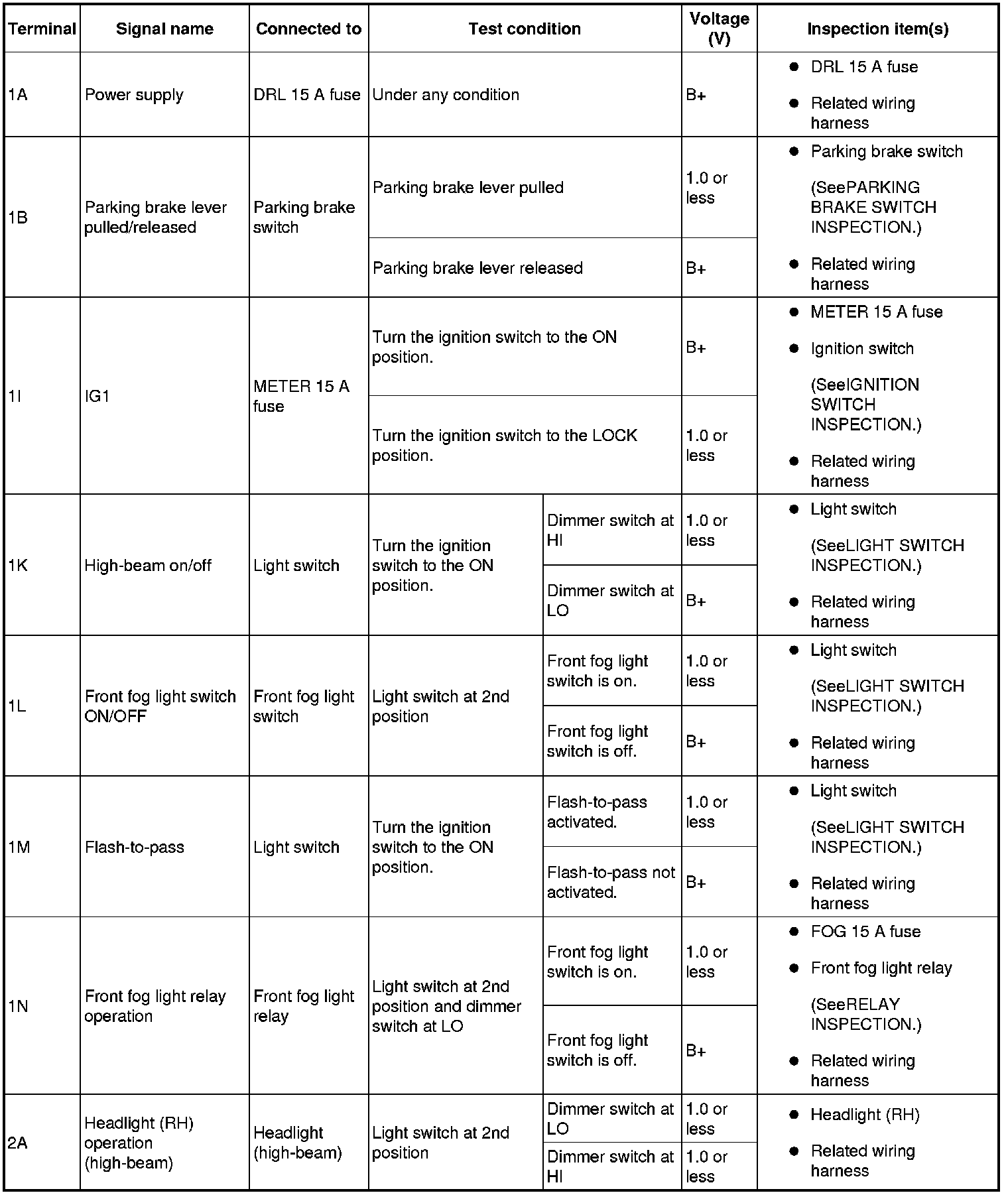 - If the voltage or continuity is not as specified in the Terminal Voltage Table, inspect the parts under "Inspection item (s)".