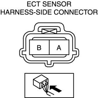 5. Place the ECT sensor in the water and while increasing the water temperature, measure the resistance between ECT sensor terminals A and B.