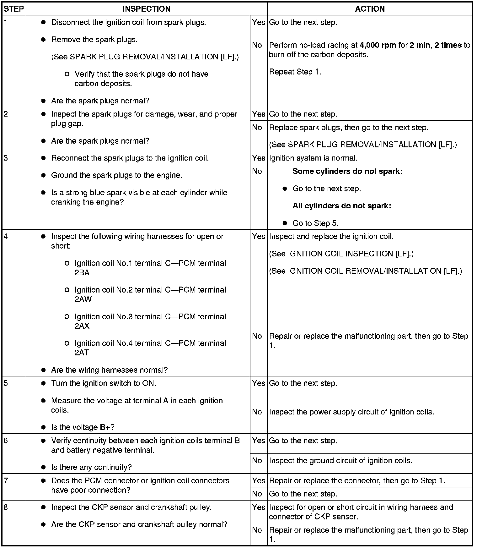 - High voltage in the ignition system can cause strong electrical shock which can result in serious injury. Avoid direct contact to the vehicle body during the following spark test.