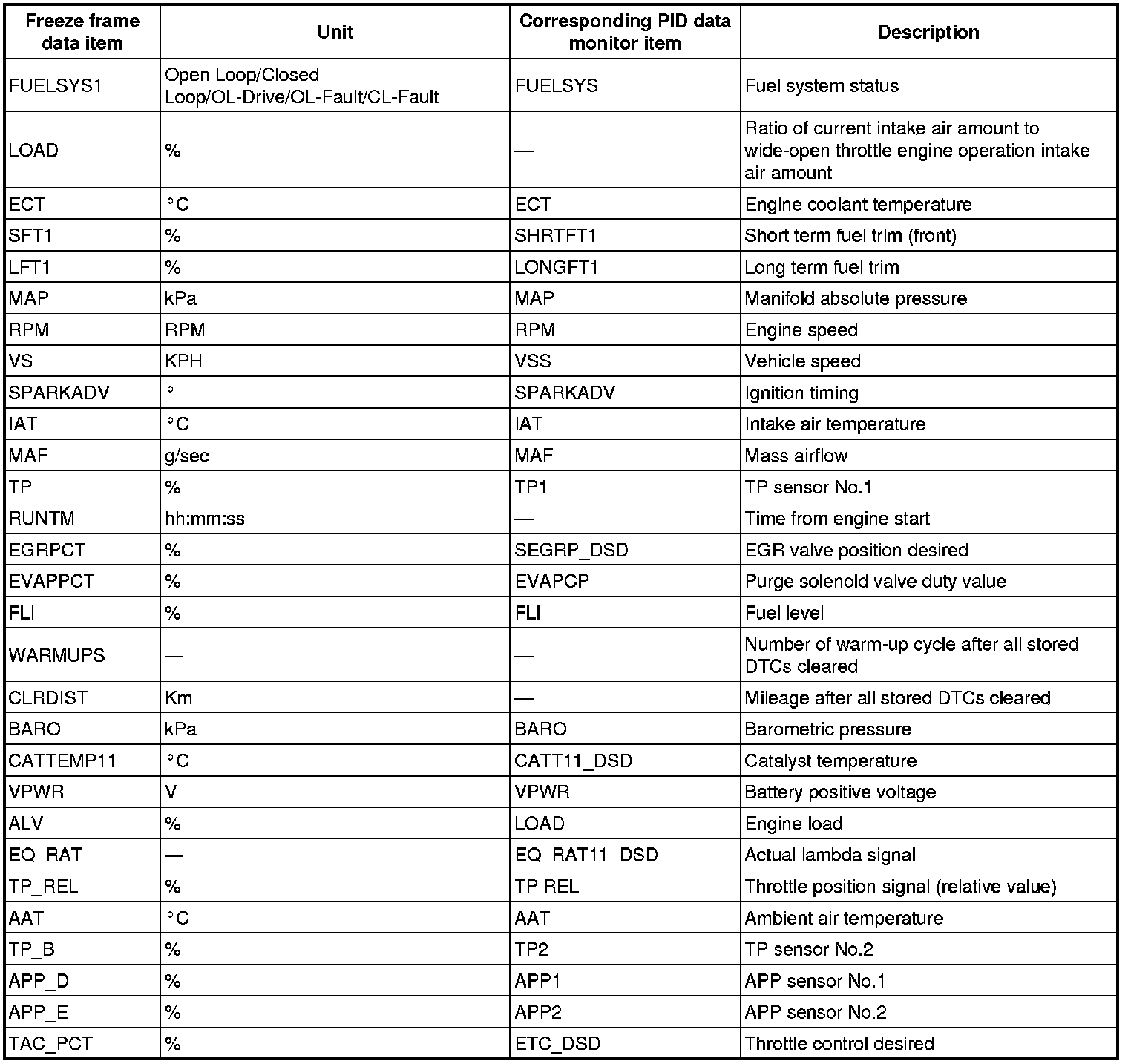 - Refer to PID monitor table for confirm the engine control system operation status while the PCM does not store the DTC. (See Component Tests and General Diagnostics)