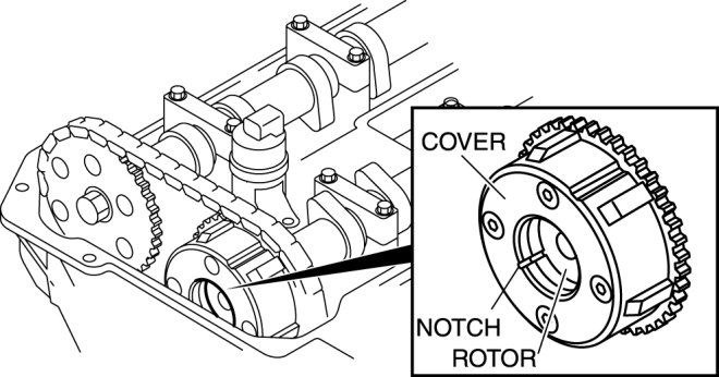 11. Confirm that notch of the rotor and bump of the cover at the variable valve timing actuator are aligned and fitted.