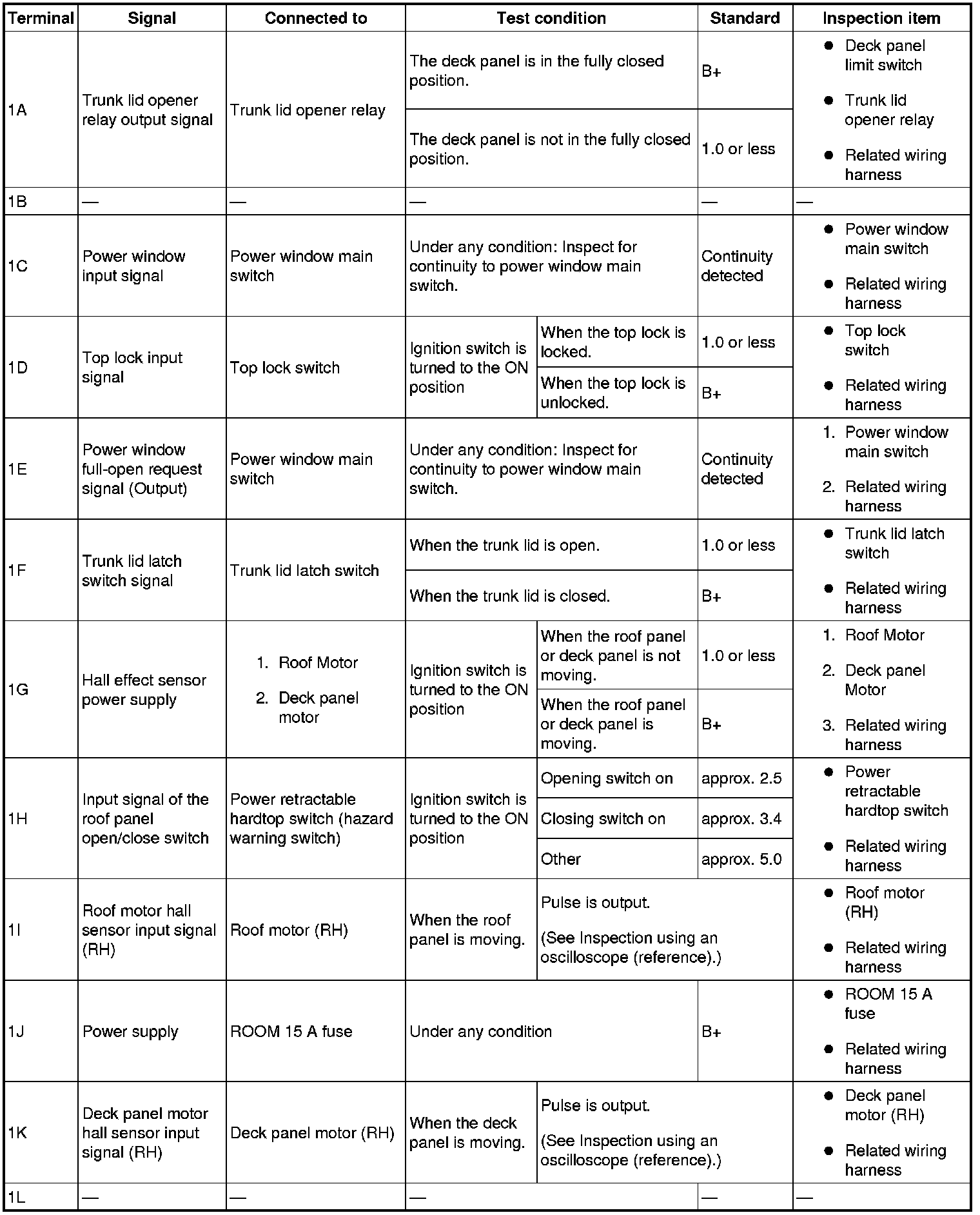 2. Attach the tester lead to the power retractable hardtop control module wiring harness-side connector and inspect voltage, continuity, or resistance according to the standard (reference) on the table.