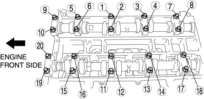 Tighten the camshaft cap bolts in the order shown with the following two steps.