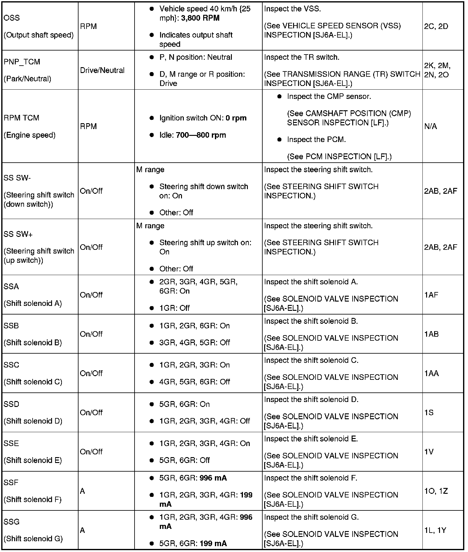 - The PID/DATA MONITOR function monitors the calculated value of the input/output signals in the TCM. Therefore, if a monitored value of an output device is out of specification, it is necessary to inspect the monitored value of the input device related to the output device control. Since an output device malfunction is not directly indicated as a malfunction of the monitored value for the output device, it is necessary to inspect the output device individually using the simulation function.