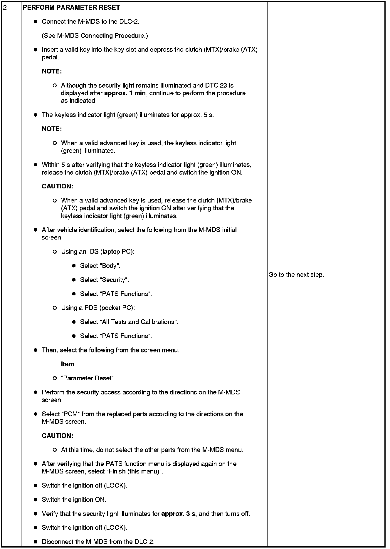 - When replacing the keyless control module, remove the valid keys and the valid advanced keys from the vehicle (keep them 1 m or more from the vehicle) and switch the ignition ON according to the directions on the M-MDS screen. Select, "There is no programmed ignition key and programmed advanced key" from the M-MDS screen.