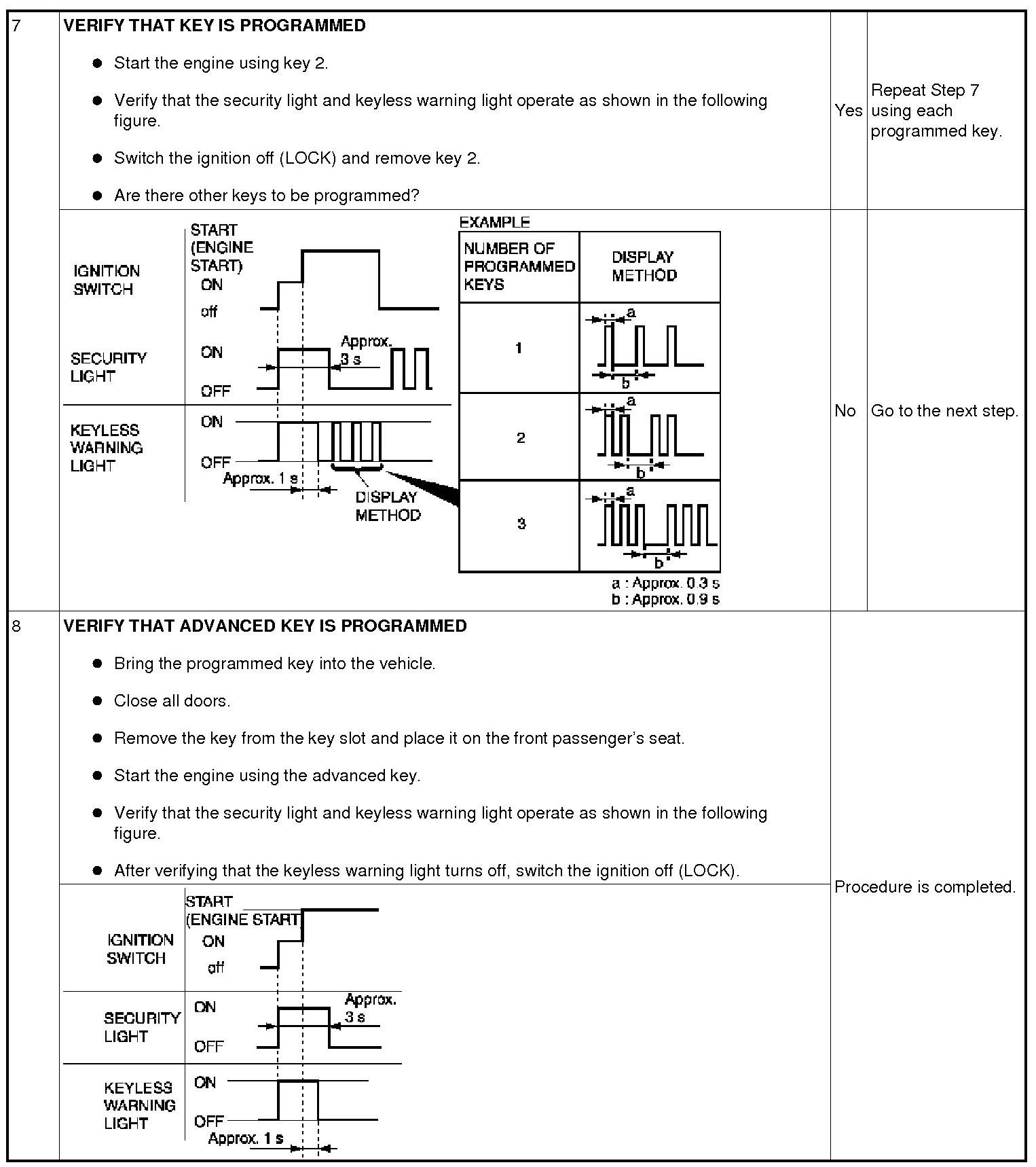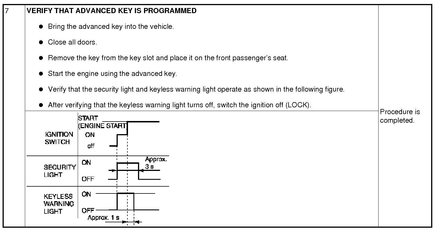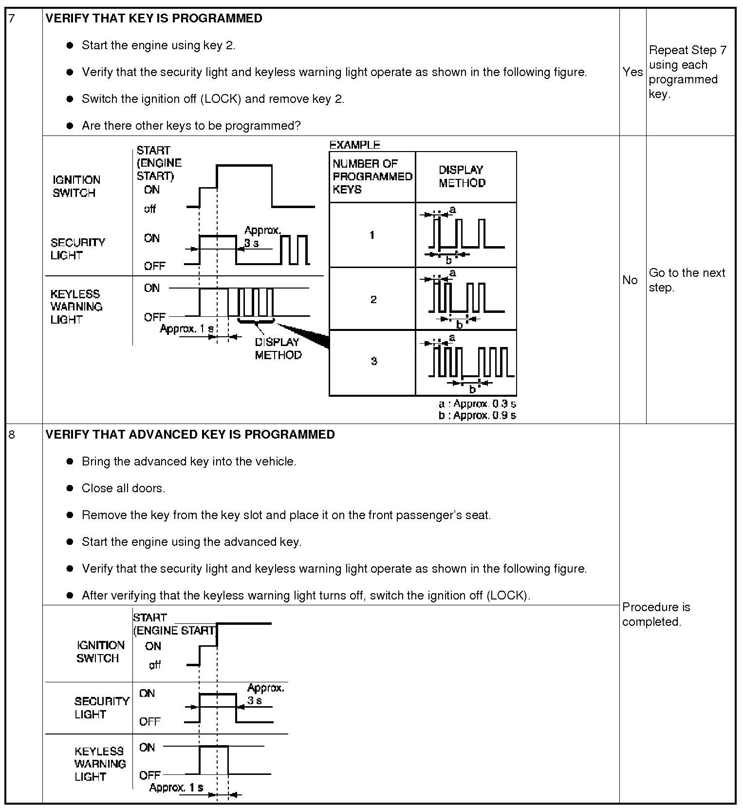 - Although the security light or the keyless warning light illuminates or flashes, this does not indicate an improper procedure. Continue to perform the procedure as indicated.