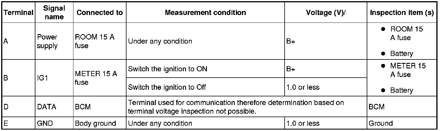 - If the voltages cannot be verified as indicated in the terminal voltage table, inspect the parts under "Inspection item (s)".