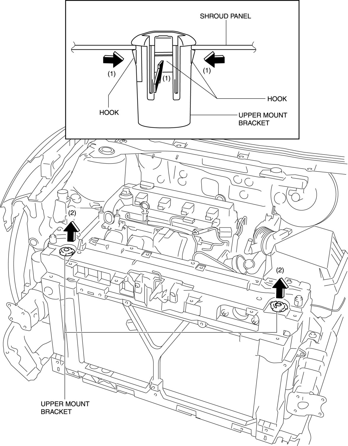 5. Push the hooks in the direction of arrow (1), and remove the upper mount bracket in the direction of the arrow (2).)