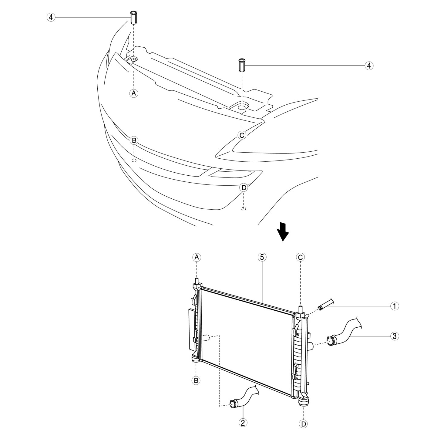 1. Lift the radiator and remove it from the radiator installation holes on the shroud panel.