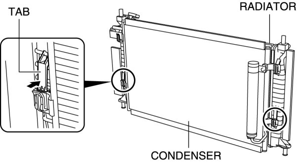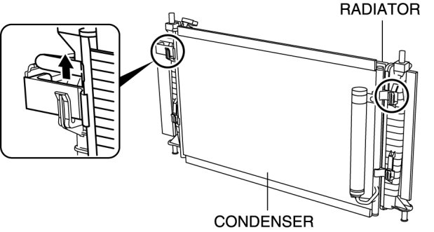 4. Lift the condenser to remove it from the left and right insertion areas on the upper side of the radiator.