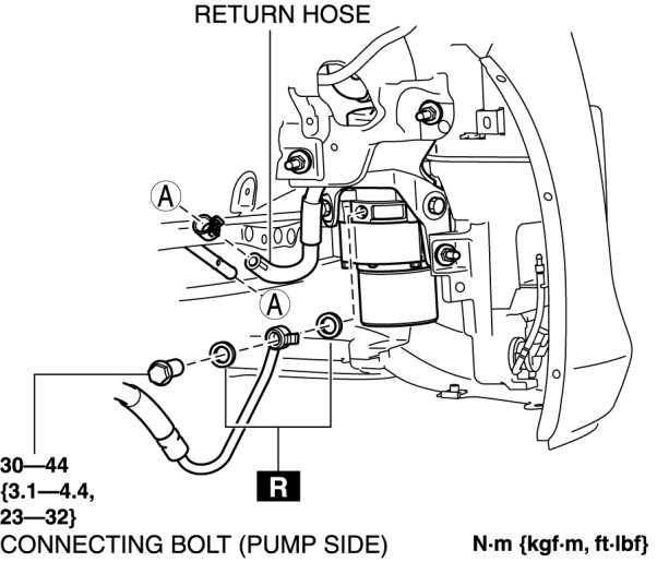 - The following procedure is for replacement of the parts shown in the figure. Regarding replacement of the suction hose and return hose, refer to the electric power steering oil pump component removal/installation. Removal and Replacement