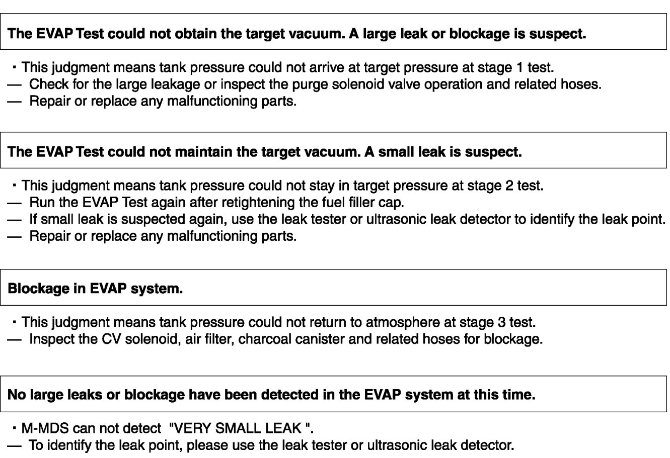 - M-MDS detects the small/large leak or blockage based on fuel tank pressure at the end of EVAP Test.