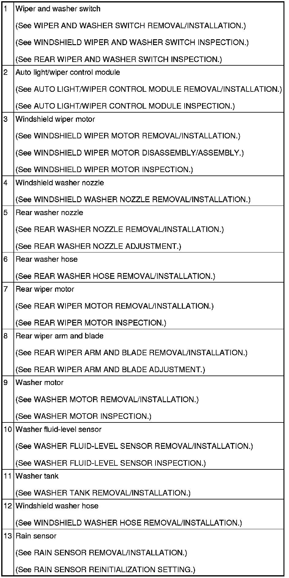 WIPER/WASHER SYSTEM LOCATION INDEX