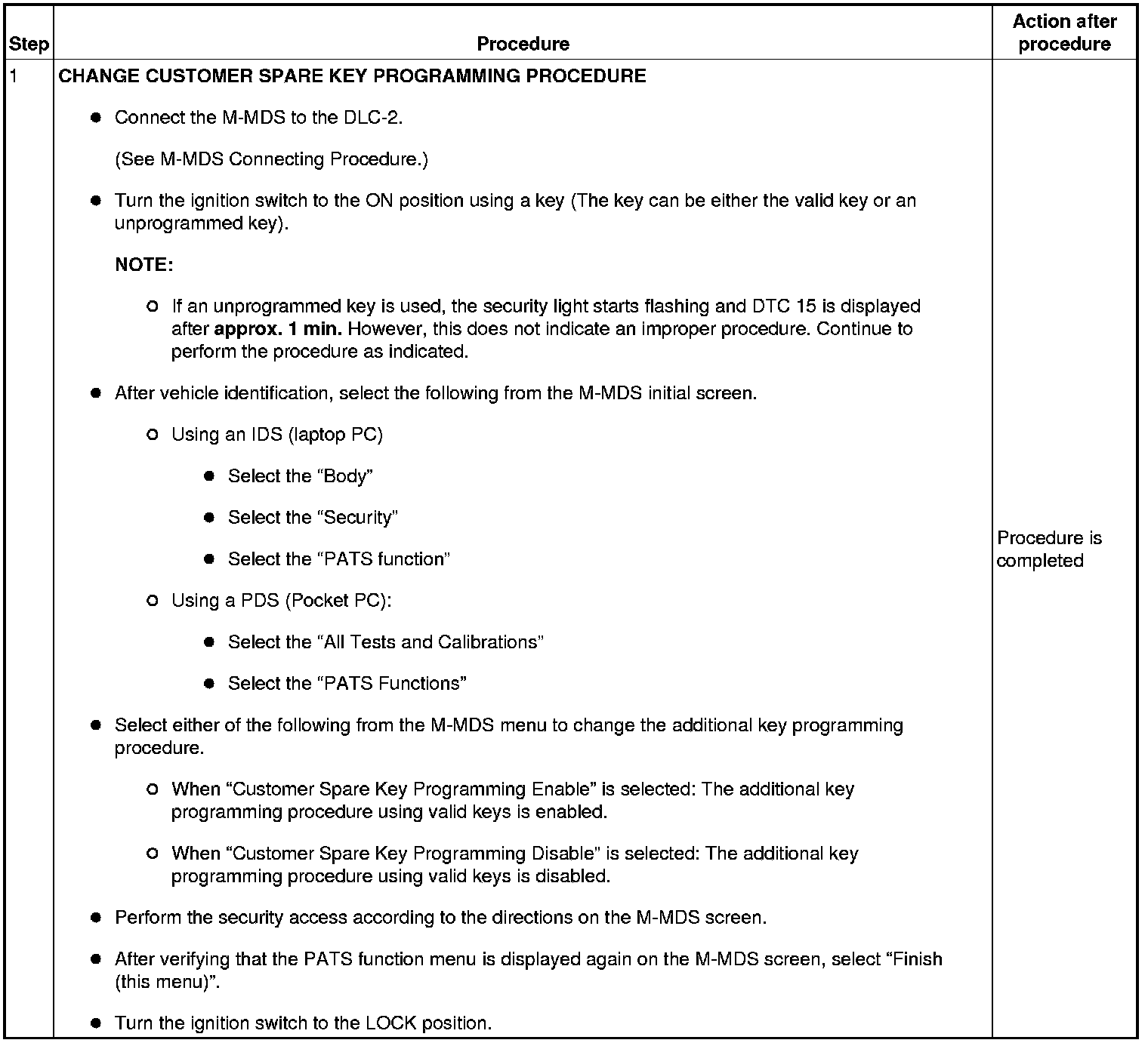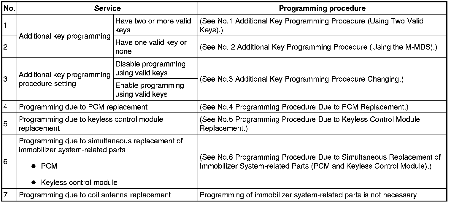 Immobilizer System-Related Parts Service and Programming Procedure Table