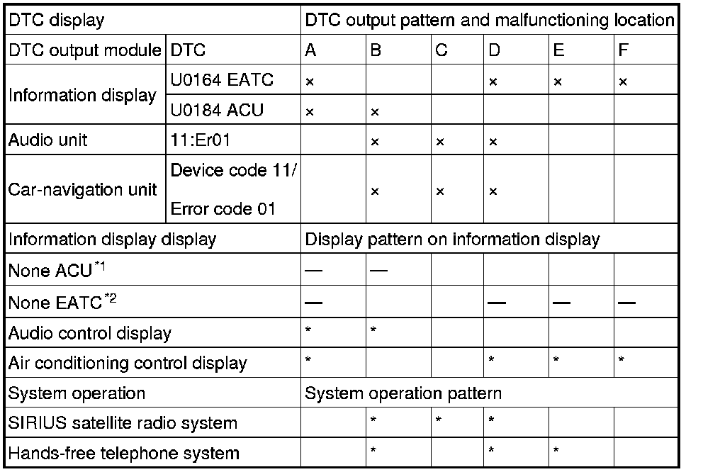 - A hyphen (-) in the DTC output pattern cell indicates that the DTC may or may not be displayed depending on the malfunction detection conditions. If it is not displayed, the malfunctioning location can be determined by checking the crosses (x) and asterisks (*).