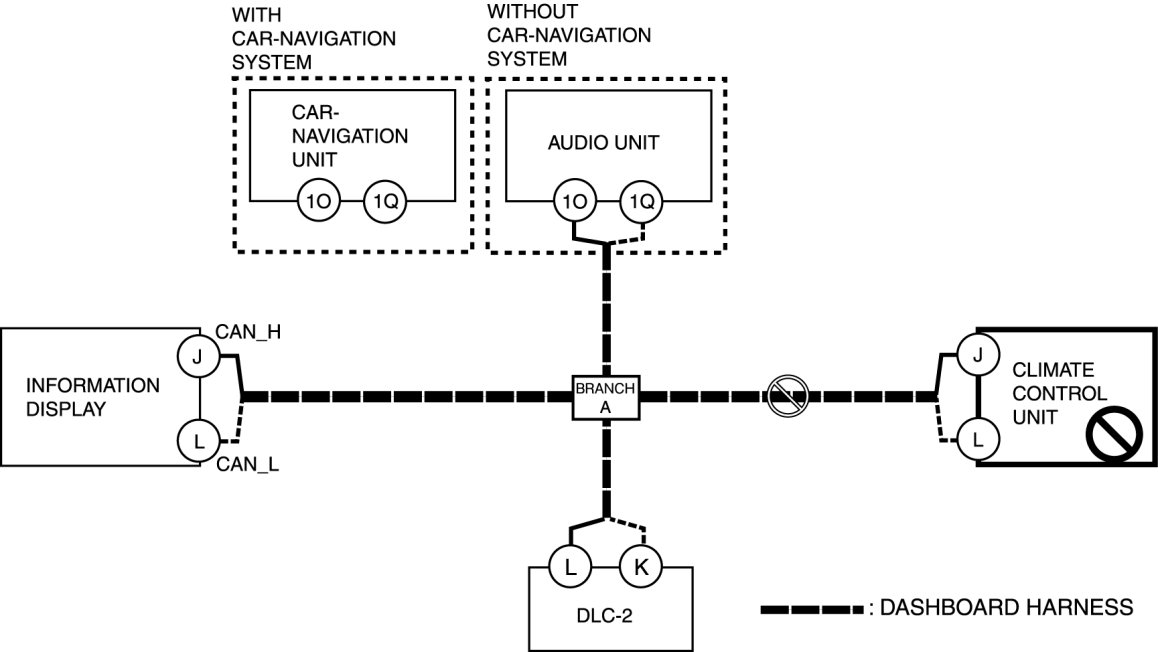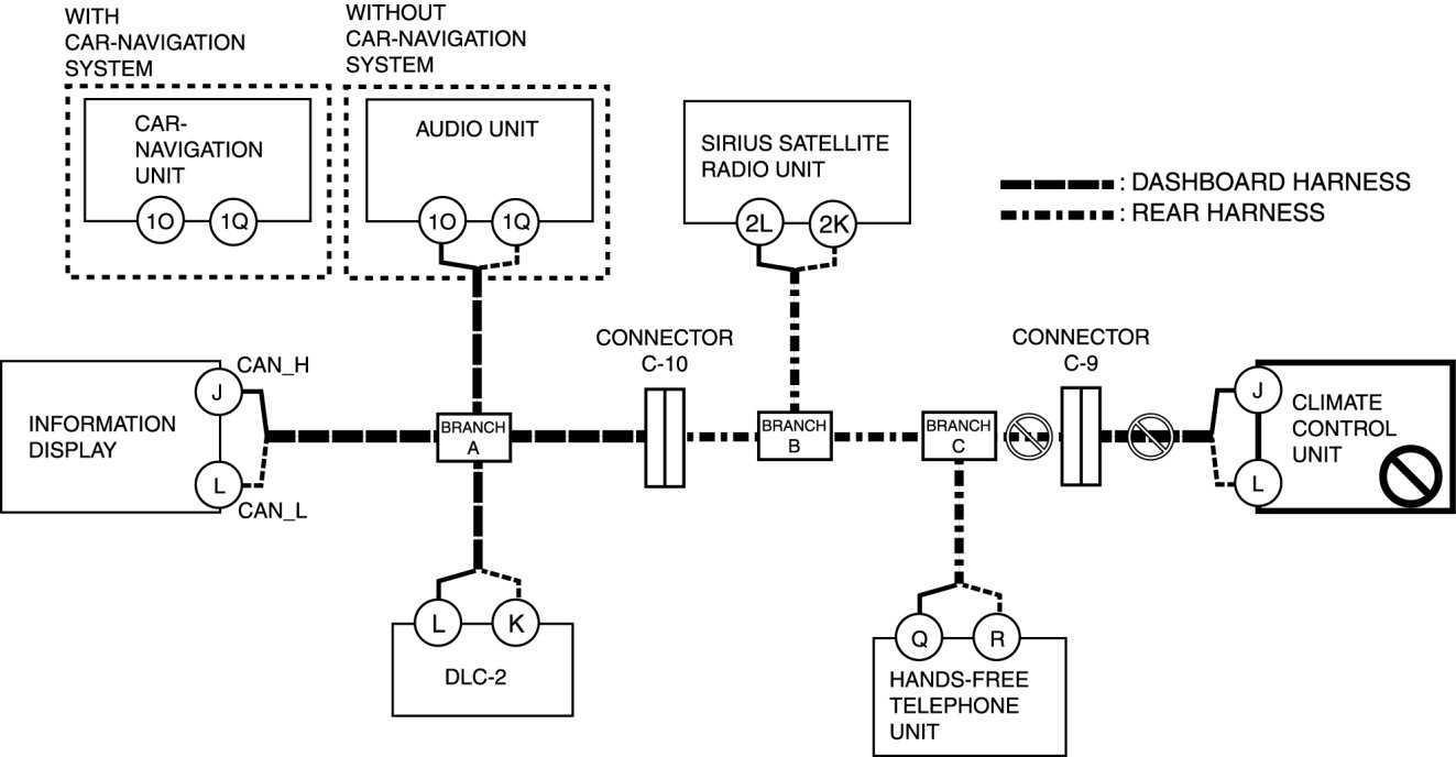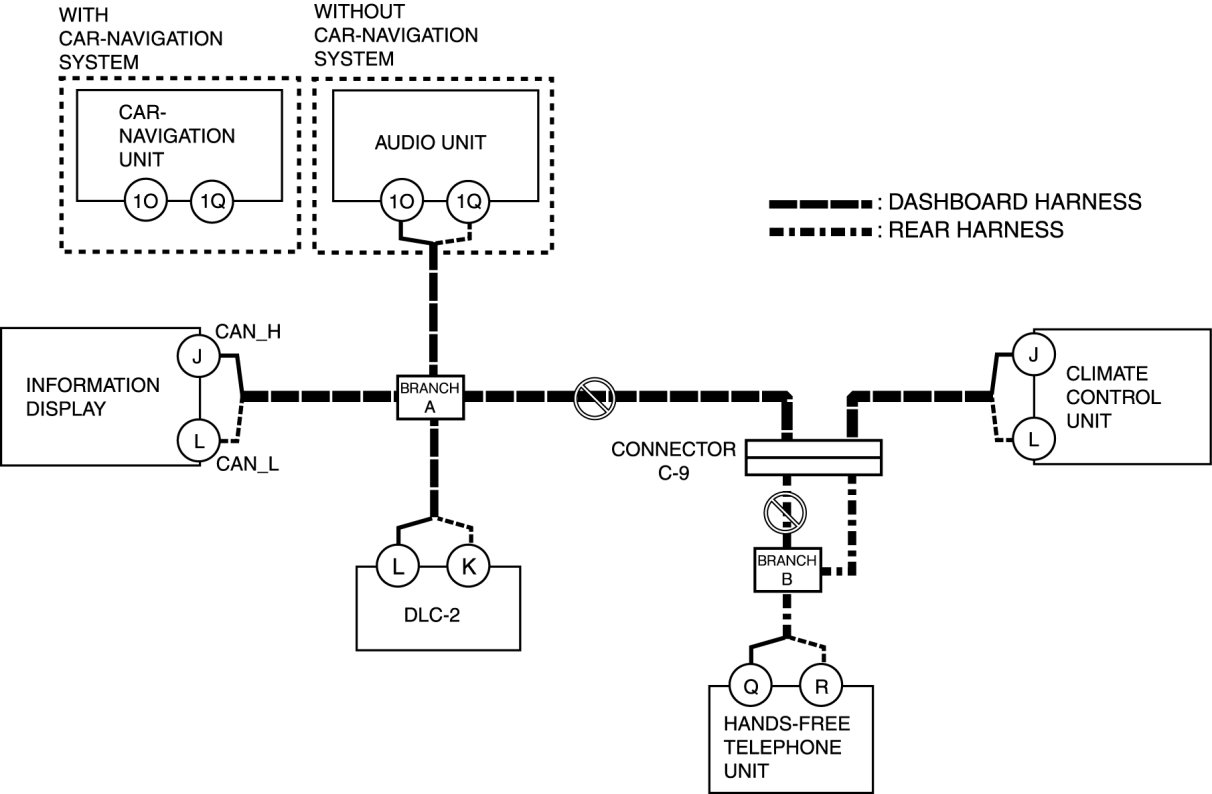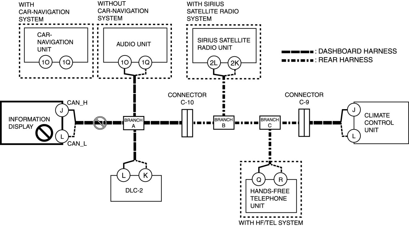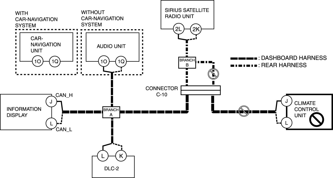 - Open circuit in wiring harness between audio unit/car-navigation unit and branch A