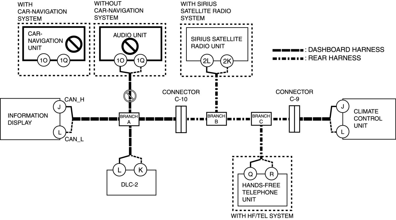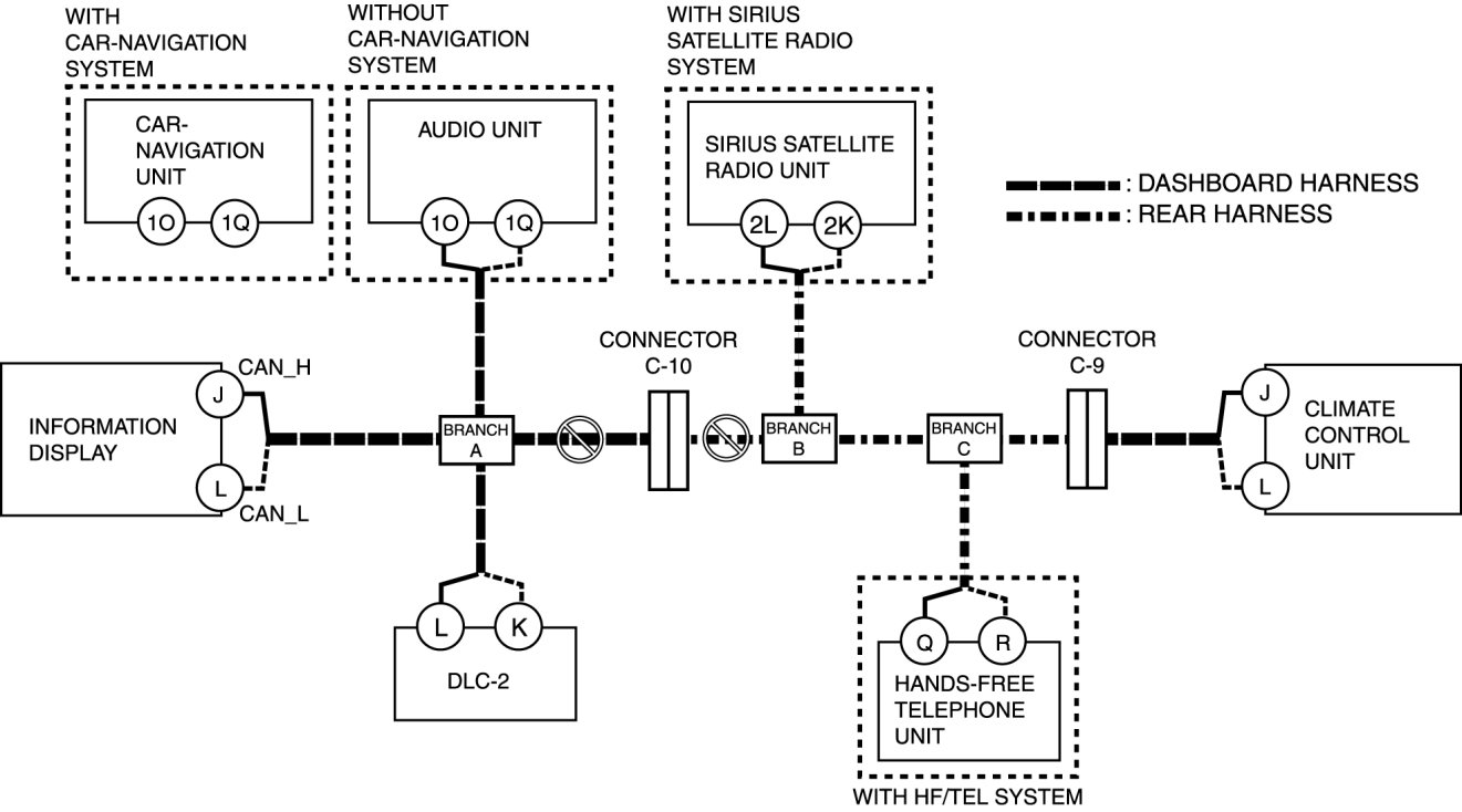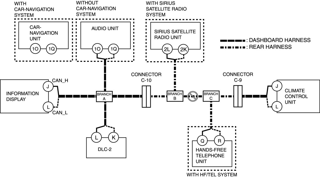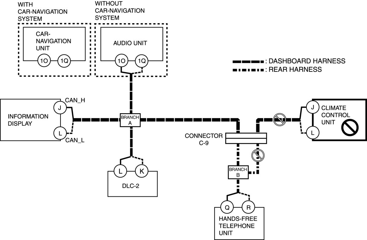 - Open circuit in wiring harness between audio unit/car-navigation unit and branch A