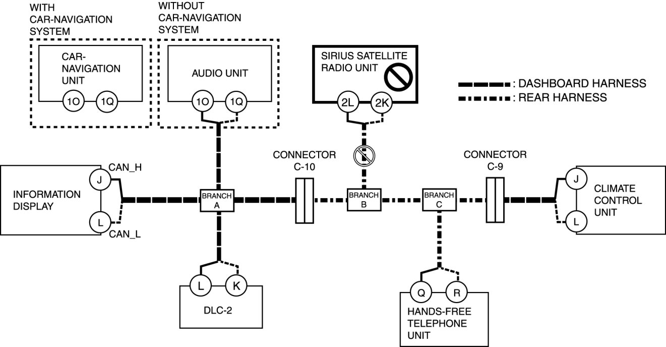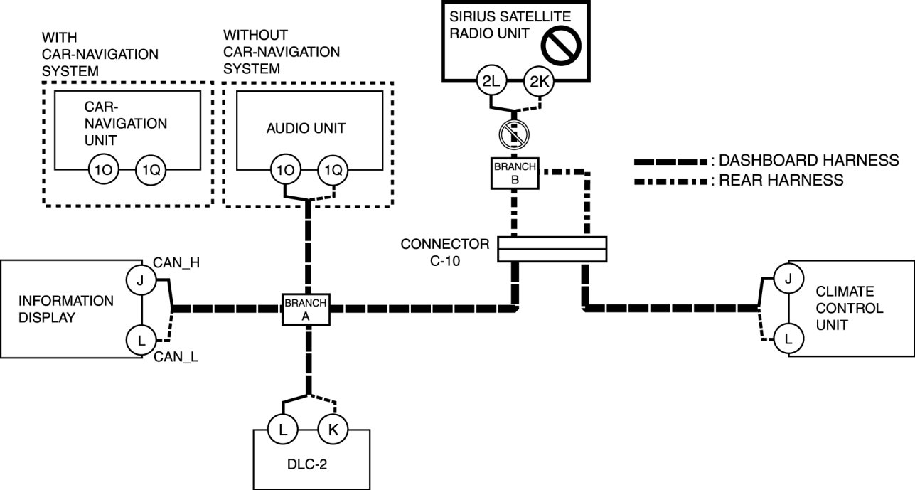 - Wiring harness between branch B and SIRIUS satellite radio unit terminal 2L